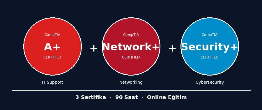 Bu üç sertifika, bilgi teknolojileri alanında kariyer hedefleyen herkesin edinmesi gereken temel yetkinlikleri kapsamaktadır. İster IT desteğinde, ister ağ yönetiminde, isterse siber güvenlikte kariyer kurmak isteyin; bu paket size geniş bir bilgi tabanı ve sektörde tanınan üç uluslararası sertifika kazandırmaktadır.